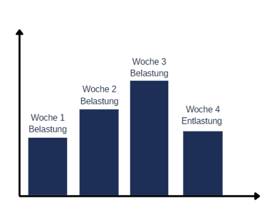 Wir trainieren standardmäßig einen 4-Wochen Zyklus, das heißt 3 Wochen steigende, intensive Belastung und in der 4. Woche Regeneration. Das bedeutet in dieser Woche sind es nur ca. vier Trainingseinheiten und diese sind locker, damit ich nicht ins Übertraining komme und mich ausreichend erhole, damit ich in dem nächsten Zyklus wieder ordentlich Gas geben kann.