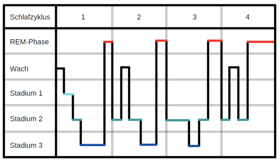Dieser dauert in etwa 90min und wird 4-7 mal während unseres Schlafes wiederholt.